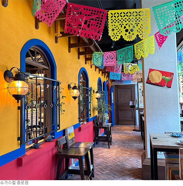 종로에 자리한 멕시칸 음식점 ‘슈가스컬’은 멕시코인에게 가장 중요한 연중행사로 여겨지는 ‘죽은 자의 날(Dia de Los Muertos)’을 배경으로 한 디즈니 애니메이션 <코코(COCO)>에서 영감을 받아 종로 한복판에 멕시코 축제의 거리를 옮겨놓았다. 멕시코 해변의 타코 노점을 연상시키는 강렬한 색채의 입구, 죽은 자의 날을 상징하는 제단, 극명한 색채의 반전과 함께 눈앞에 완벽하게 구현된 멕시코 거리까지, 입구에 들어서는 과정부터 반전의 즐거움을 선사하며 단 몇 걸음만으로 방문객들을 이국의 축제로 초대한다. 슈가스컬 브랜드를 만든 서울랜드 외식사업부는 정교한 기획력과 트렌디한 감각의 공간 연출, 현지의 맛과 디테일을 살린 메뉴 구성 등을 통해 찍고, 먹고, 즐기기에 최적화된 브랜드를 잇따라 선보이고 있다.