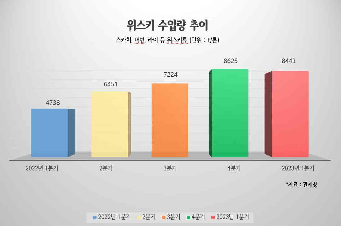 2022년 국내 위스키 수입액은 약 2억6,000만 달러(약 3436억원)으로 2007년 이후 최고치를 기록했다. 또한 관세청 수출입 무역통계에 따르면 2023년 1월부터 7월까지 국내 위스키 수입량은 동기 대비 1만3,700톤에서 1만9,878톤으로 45% 이상 늘었다. 버번위스키는 2020년 805톤, 2021년 1,167톤에 이어 2022년에는 2,607톤으로 수입량이 불과 3년 만에 3배 이상 크게 증가했으며, 스카치위스키도 2020년 4,588톤에 이어 2021년 5,677톤, 2022년 8,999톤으로 꾸준히 증가세를 보이며 위스키의 전통 강자답게 수입량 1위를 달리고 있다. 엔데믹 이후 소주, 맥주 등 시장을 양분한 주류 주종들은 소폭 상승한 데 반해 드라마틱한 결과다.