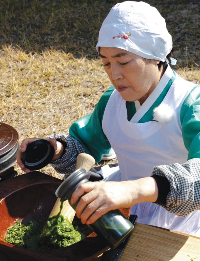 이연순 명인: 동일한 맛을 안정적으로 내야 할 때는 데치기 대신 ‘찜’을 권합니다. 승검초즙을 넣은 찹쌀 반죽을 동글게 빚어 면포를 깐 시루에 올려 20~30분 쪄 쓰면 수분·점성이 균일해져요. 또 전통의 맛을 해치지 않는 선에서 믹서로 즙을 내는 방법도 효율적입니다. 보관은 급속 냉동 후 자연 해동이 가장 좋고, 다시 찌면 과도한 찰기가 생겨 식감이 무너집니다.