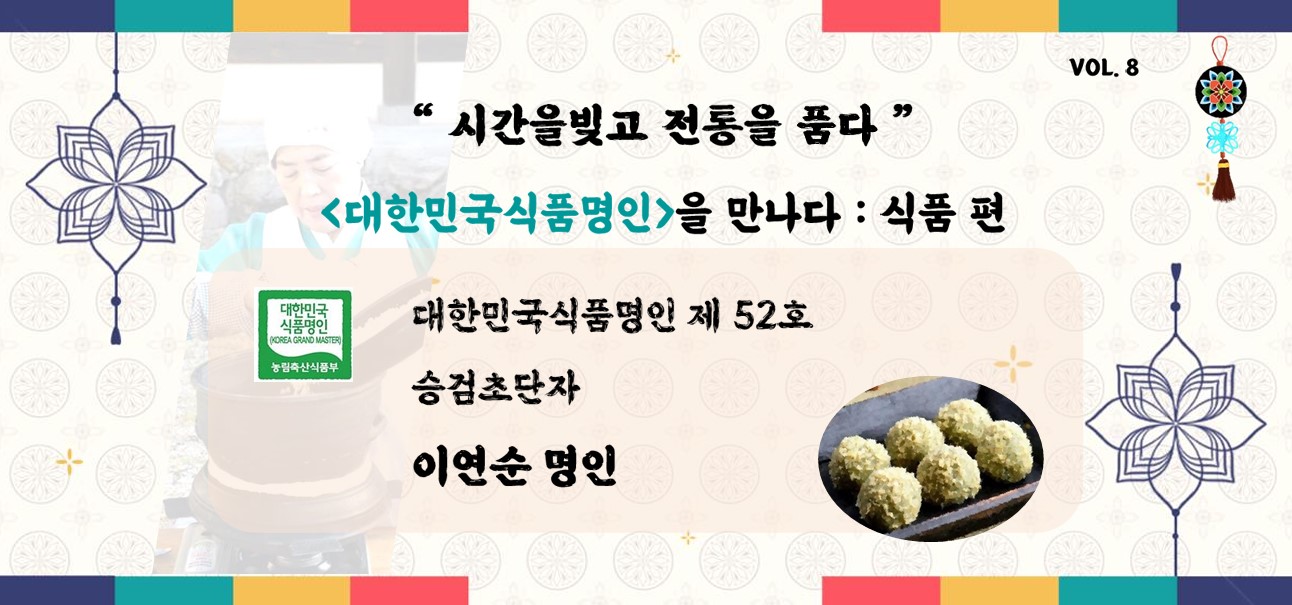 이연순 명인: 2006년 ‘향토음식개발연구원’을 세웠고, 2010년 농림수산식품부 ‘우수체험공간’으로 선정됐습니다. 2007년 ‘서울국제요리경연대회’ 대상, 같은 해 ‘한국음식대전’ 대상 등 상을 받았고요. 2009년 전통음식 기능보유자 자격을 취득해 제조·교육은 물론 소상공인 컨설팅, 비법 전수, 창업 상담까지 활동 폭을 넓혔습니다. 인도 조리경연 심사위원 참여, 『우리 떡 우리 한과』 공저 출간, 전통떡 판로 확대 등도 이어왔고요.