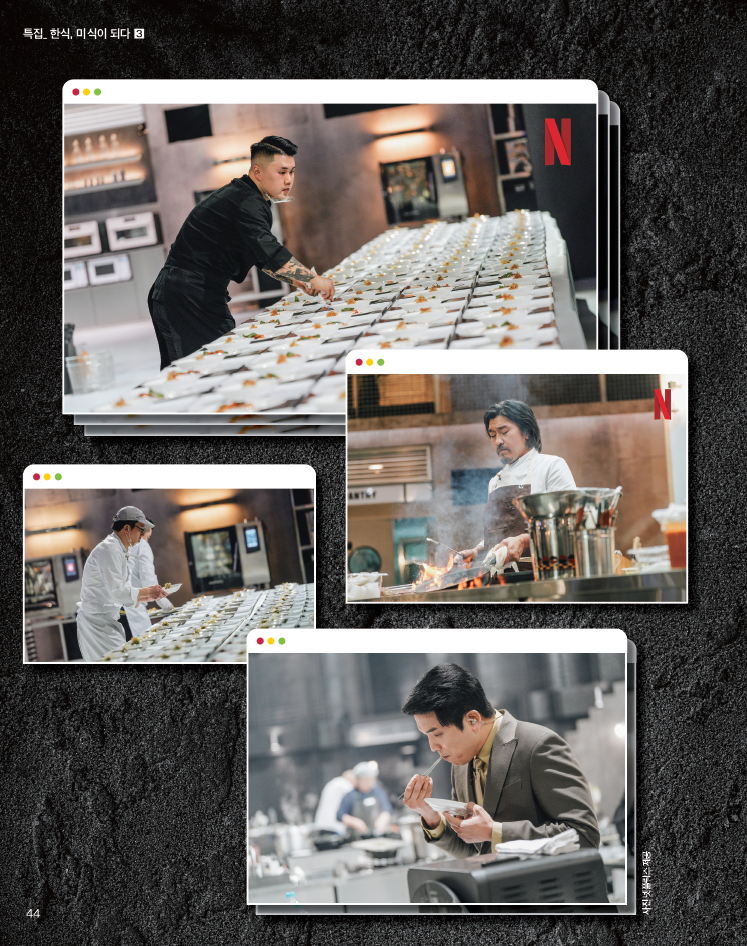 넷플릭스에서 방영된 서바이벌 요리 예능〈흑백요리사〉 파이널 라운드는 한식 파인 다이닝을 향한 열기를 단적 으로 보여줬다. 〈흑백요리사〉시즌 1에서 에드워드 리 셰프는 삶은 쌀떡을 갈아 만든 반죽을 떡 모양으로 빚어 얼린 후, 고추장 캐러멜 소스를 넣어 ‘나머지 떡볶이 디저트’를 만들었다. 한국의 정(情) 문화와 이민자로서 자신 의 삶이 담긴 이 음식은 심사 위원과 시청자의 찬사를 받았다.