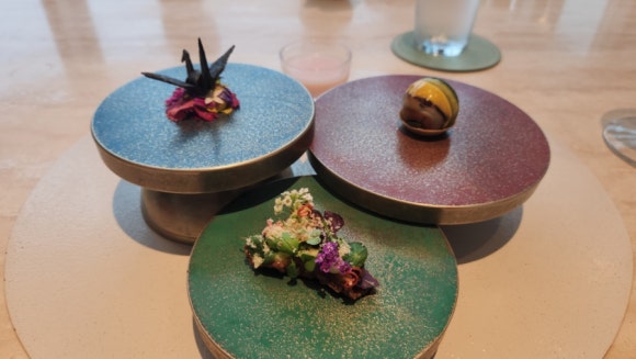 밤껍질을 우려낸 물에 밤과 쌀로 만든 밤미음, 술지게미와 팥으로 완성한 가볍고 살짝 얼린 공기 주입 케이크, 자개함에 담긴 쁘띠푸르까지