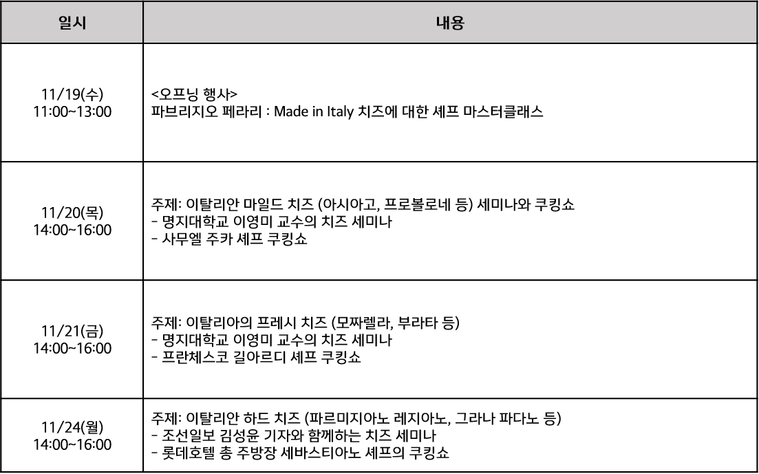 이어지는 일정에는 이탈리아 치즈를 주제로 국내 전문가가 펼치는 △교육 세미나와 이탈리아 북동부 프리울리(Friuli) 지역의 명문 요리사 가문 출신 사무엘 주카(Samuel Zucca) 셰프, 이탈리아 요리학교 ALMA 한국 앰버서더 프란체스코 길아르디(Francesco Ghilardi) 셰프, 롯데호텔 총 주방장 세바스티아노 잔그레고리오 (Sebastiano Giangregorio) 셰프가 참여하는 △쿠킹쇼, 그리고 이탈리아 무역공사 관장 페르디난도 구엘리(Ferdinando Gueli)가 진행하는 △이탈리아 지역 홍보 세션이 마련된다. 이를 통해 아시아고 · 모짜렐라 · 파르미지아노 레지아노 등 이탈리아의 주요 지역 치즈들이 소개될 예정이다.