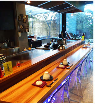 가정집을 개조한 공간이고 생각되지 않을 정도로 트랜디한 분위기를 갖춘 일식당이다. 보랏빛 조명이나 라운지 풍의 딥하우스 음악이 마치 뉴욕의 어느 레스토랑을 연상케 한다. 정형화된 일식당의 분위기를 탈피하고 청담동에 준하는 퀼리티를 보여주고자 문을 열었다. 매장에는 스시 바와 데판야키 바가 각각 자리하고 있다. 스시는 창작스시에 가깝다. 절인 타피오카나 매실장아찌, 젤라틴으로 굳힌 복껍질 등을 활용한다. 데판야키 역시 육해공을 넘나드는 다양한 식재료를 이용한다. 소고기면 소고기, 해산물이면 해산물대로 각각 다른 소스로 조리를 한다. 무엇보다도 데판야키의 별미라 할 수 있는 화려한 퍼포먼스가 곁들여진다. 철판에서 조리를 하면서 저글링이나 불쇼 등을 보여주니 기분이 한층 더 업 된다. 스시와 데판야키 모두 놓치고 싶지 않은 이들을 위해 세트 메뉴도 판매한다. 바 외에도 테이블이 마련되어 있으나 보다 즉흥적인 요리들을 즐기고자 한다면 바테이블을 추천한다.
