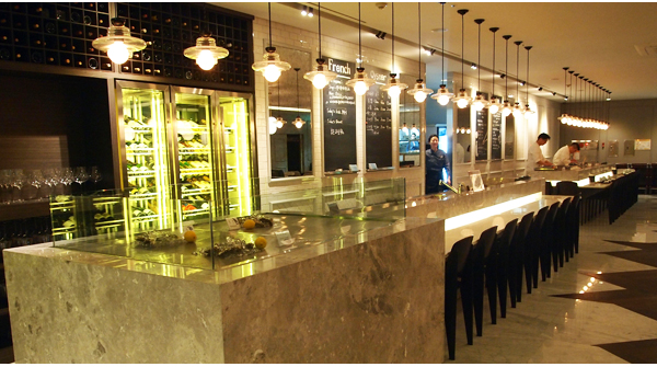 국내에는 조금 생소한 오이스터바를 컨셉으로 삼았다. 길다란 바 테이블에 앉아 즉석에서 생굴을 맛볼 수 있도록 한 이곳은 파헤칠수록 색다른 컨셉들이 공존하는 공간이다. 오이스터바와는 별도로 모던 프렌치를 기반으로 한 레스토랑이다. 그런데 한쪽에서는 일식테이블을 두고 셰프가 스시를 쥐어주기도 한다. 입구에는 묵직한 분위기의 바가 마련되어 있어 각종 스카치위스키, 와인, 병맥주를 즐기기도 한단다. 전체 규모는 제법 큰 편인데 공간적인 측면을 강조해 세련되면서도 모던한 분위기를 자아낸다. 인테리어 역시 유명 디자이너의 손길이 닿은 공간이다. 홀 정 중앙으로 들어서면 좌우로 나란히 자리한 길다란 바 테이블을 볼 수 있다. 한쪽은 생굴은 즉석에서 즐길 수 있는 오이스터바고 오른쪽은 스시를 선보이는 일식 바 테이블이다.
