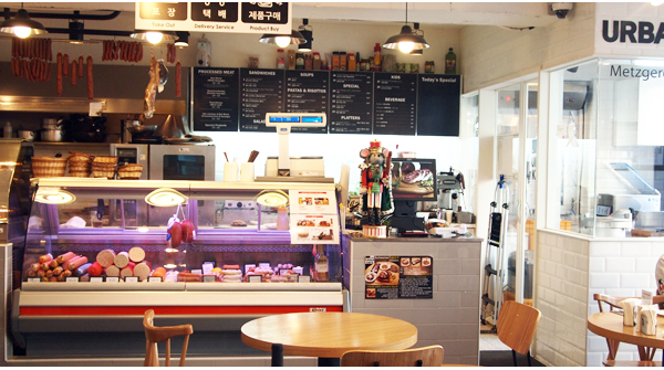 강변에 새롭게 문을 연 ‘어반나이프’ 한국형 메쯔거라이(Metzgerei)를 컨셉으로 삼고 있다. 메쯔거라이는 소, 돼지 등의 가축들을 직접 정형하고 소세지나 햄 등으로 가공하여 판매하는 곳을 말하며 델리카트슨(Delicatessen) 이라고도 한다. 흔히 독일에서는 메쯔거라이 미국이나 호주에서는 델리샵, 부처샵 등으로 통용된다. 지난해 축산물위생관리법이 새롭게 개정되며 식육즉석판매가공업이 신설되어 드디어 제대로 된 수제 소시지와 햄을 맛볼 수 있는 곳이 등장하게 된 것이다.