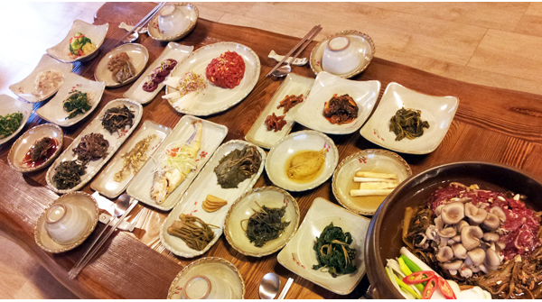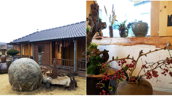 차를 운전하는 기사는 몇 번이나 이곳이 맞느냐고 물어왔다. 여기에 무슨 식당이... 갸우뚱할 뿐이다. 좀 더 설득하여 골목 안으로 들어서니 마을회관 앞에 넓은 공터가 나온다. 일단 차를 세울 수 있게 되어 안심하는 눈치다. 그래도 식당은 보이지 않는다. 골목 안으로 더 걸어 들어가니 큰항아리에 흰색으로 쓰여진 ‘장수밥상’이 보인다. ‘설마 여기가 맛집이라니?’ 하는 표정들이다. 일단 들어갔다. 앞마당으로 걸어가는 길의 처마 밑에는 갈무리 채소들이 이것저것 걸려있고 깔끔히 정돈된 앞뜰 정원이 마음을 푹 놓이게 한다. 작고 아담하다. 누가 설명하지 않아도 본채는 살림집이고 아래채가 식당임을 알 수 있다. 가을걷이가 창고에 그득하고 봄꽃을 기다리는 텃밭은 그저 편안하다. 10남매의 맏이인 남편에게 시집온 태선희 사장의 신방이 40년이 지나 장수밥상이라는 맛집으로 거듭날 줄이야! 많은 시동생들의 보호자 노릇을 하며 키우고 시집장가 보내고 긴 세월 모셨던 시어머니도 돌아가셨다. 고맙게도 자식들은 어머니의 고생이 약이 된 양 제 앞가림을 잘해서 각자 보금자리로 찾아갔으니, 이제 부부만 남아 긴 세월 북적거리던 집에서 석부작, 목부작을 만들며 밥집을 즐거운 소일거리인양 하면서 살아가고 있다. 본인이 농사지은 걸로 차려지는 밥상이라기에 태사장의 식재창고가 참 궁금했다. 정리 못해놨다고 손사래 치며 보여준 창고는 먼지 하나 없이 깔끔한 모양새다. 허툰 게 없다. 가을에 수확한 무청시래기가 삶지 않은 채 4개월쯤 바싹 말린 것이 커다란 투명자루마다 한 가득씩 담겨있다. 마른 시래기도 이렇게 푸르를 수 있구나! 이 시래기가 있기에 연중 장수한우와 시래기를 넣은 전골이 가능하겠지. 창고 내 저온저장고를 열어보니, 단지단지 장아찌가 그득한 건 이해가 가지만 양동이에 여러 색상의 장미꽃이 한 다발 꽂힌 채 살짝 비닐이 덮여있는 것 아닌가. ‘시골에 웬 장미?’라는 의문은 방안에 들어와 밥상을 받고서야 풀리게 되었다. 꽃을 좋아해서 꽃을 심고 장미, 국화, 야생화 등 갖가지 꽃차에 조예가 깊은 사장은 손님상에 꽃이 빠지는 것을 용납할 수 없어 꽃이 귀한 겨울이나 이른 봄날엔 장에 가서 일부러 장미다발을 사온다는 것이다. 작은 것에 내가 감동한 걸까? 작은 것으로 태사장이 나를 감동시킨 것인가? 여하튼 밥상의 장미꽃은 웃고 있었다.