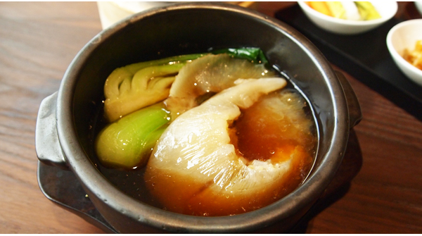 특히 이곳의 샥스핀을 주목할 필요가 있다. 샥스핀은 국내에서 가공된 것을 사용한다. 염도도 깐깐하게 체크해 기준치보다 낮은 것을 들여온다. 요리는 광동식통샥스핀탕과 상어지느러미찜으로 즐길 수 있다. 찜 요리는 청채를 곁들인 굴 소스와 함께 제공된다. 샥스핀탕은 셰프가 자신 있게 추천하는 메뉴 중 하나다. 다른 곳과 비교해볼 때 확연한 차이를 보여준다. 농도에서부터 알 수 있는 진한 육수가 이 집만의 특징이라 할 수 있다. '농탕'스타일이라 하여 약 3시간정도 상어 뼈와 소 뼈를 함께 우려 육수를 뽑기 때문에 보다 걸쭉하고 진한 국물을 맛볼 수 있는 것이다.