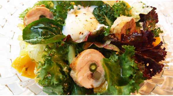 치킨에그샐러드는 기존 흔하게 볼 수 있는 닭가슴샐러드가 아니다. 좀더 쫄깃한 맛의 닭다리를 이용했다. 닭다리는 뼈를 발라 그린빈과 사과, 표고버섯을 넣고 말은 후 로스팅 했고 망고와 채소가 함께 들어간다. 뿐만 아니라 포치드 에그도 곁들여지는데 먹기 전 으깨어 버무리면 된다. 본연의 맛을 제도로 즐길 수 있도록 드레싱은 개운하면서도 상큼하게 즐기기 좋도록 타라곤과 레몬을 이용했다.