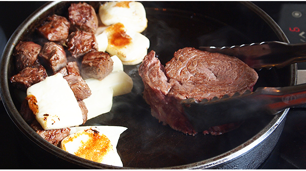 고기는 가장 대표적인 등심이나 지방이 적어 담백한 맛이 일품인 안심을 많이 찾는 편이다. 그 밖에도 살치살이나 특수부위를 한정 판매로 선보이기도 한다. 특수부위는 당일 선별한 것들로 구성이 되는데 치마살, 토시살, 제비추리 등이 있으며 선도가 만족스럽지 못한 경우에는 판매를 하지 않는 정책을 고수하고 있다. 숯불 직화 구이가 아닌 인덕션으로 굽는데 열을 오랫동안 유지할 수 있도록 불판도 따로 주문 제작했다. 주문한 고기는 숙련된 스탭이 각종 도구를 이용해 적당한 상태로 구워주며 인덕션의 코팅효과 덕에 숯불과 달리 고기가 마르지 않고 마지막 한 점까지 풍부한 육즙을 즐길 수 있는 것이 특징이다.