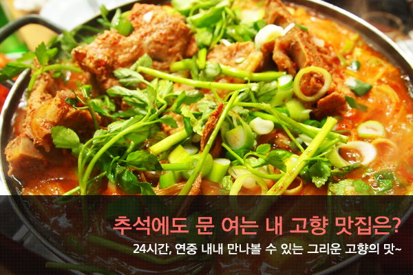 민족 최대의 명절인 한가위를 코 앞에 두고 있다. 예년보다 추석이 한 달 가량 빠르게 찾아오면서 가족과 친지를 좀더 빨리 만나볼 수 있게 되었다. 온 가족이 함께 모이는 명절을 더욱 알차게 보내려면 무엇을 해야 할까? 추석에 즐겨 하는 놀이인 연날리기나 왁자지껄 윷놀이를 하며 시간을 보내는 것도 좋지만 오랜만에 찾은 고향에서 가족과 나들이를 떠나 고향의 정취를 만끽하며 소중한 시간을 보내는 것도 특별할 것이다. 금강산도 식후경, 우선 내고향 맛집을 찾아가는 것도 잊지 말자. 고향 나들이를 더욱 풍성하게 해 줄 내 고향 24시 맛집을 소개한다.