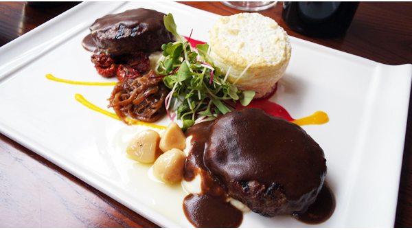이 집 함박스테이크가 특별한 이유는 패티 옆에 곁들여지는 스펀지에그 때문이다. 이름 그대로 스펀지처럼 폭신한 계란 요리로 풍성하게 거품을 낸 흰자와 노른자를 이용해 만든다. 방문한 이들로 하여금 십중팔구 흥미를 불러일으키는데, 패티 위에 올려 반으로 잘라내면 노란 계란 노른자가 흘러나와 소스의 맛을 한층 더 돋워준다. 점심에는 둥그런 접시에 샐러드, 밥도 함께 담아내므로 포만감 있는 식사를 즐길 수 있다.