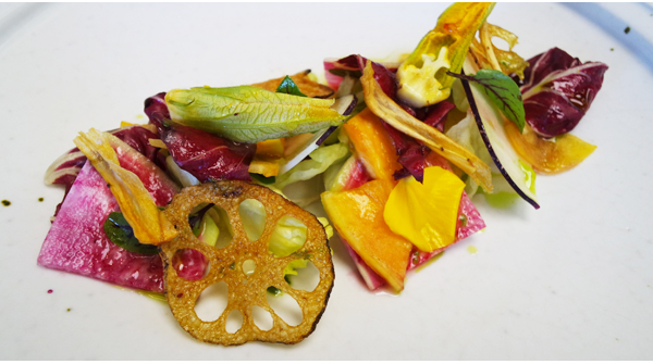 전식의 일종인 침채샐러드는 늙은 호박과 양상추를 기본으로 계절에 즐길 수 있는 갖가지 뿌리채소가 곁들여진다. 뿌리채소는 당근, 우엉, 연근, 무 등이다. 드레싱으로는 배속을 갈아 만들어 개운한 단맛을 살렸다. 제철 튀김요리가 제공되는 오늘의 튀김요리도 눈 여겨 볼만하다. 숯불한치구이는 이름 그대로 숯불에 한치를 구워 낸 요리다. 여기에 대파를 함께 구워 올리는데 소스는 부추를 다진 것에 올리브와 케이퍼를 넣어 만들고, 깻잎도 튀겨 올린다.