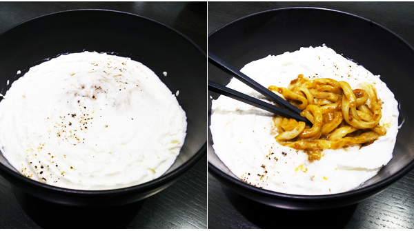 메뉴도 하나씩 짚어보자면 톡톡 튀는 아이디어가 녹아난 것들이 제법이다. 이곳의 대표 메뉴 중 한 가지라 할 수 있는 에스푸마 카레우동은 생김부터가 호기심을 불러일으킨다. 깊은 볼에 담겨 나오는 요리지만 면발은 보이지 않고 뽀얀 크림이 소복하게 담겨 나온다. 에스푸마란 스페인어로 거품, 크림을 뜻한다. 크림의 정체는 감자를 삶고 생크림과 함께 섞어 올린 것이다. 이 안에는 매콤함을 가미한 카레 소스에 버무려진 우동이 숨겨져 있다. 이 요리를 먹을 때 유의할 점은 면과 크림을 섞으면 안 된다. 젓가락으로 우동을 집어 올릴 때 자연스레 묻어나는 크림의 조화로 부드러운 맛과 매콤한 카레의 맛을 동시에 느낄 수 있기 때문이다.