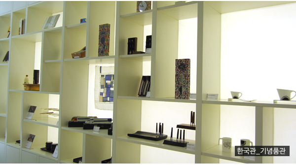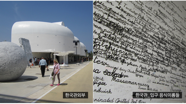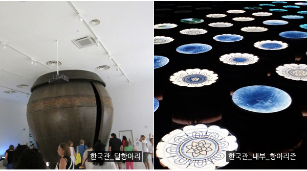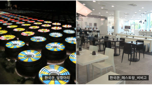 한국의 숨 쉬는 옹기와 발효의 신비를 사계절로 표현하였다. 햇볕이 내리쬐는 여름에서 눈이 내리는 겨울까지 일련의 계절 변화 속에서도 발효는 쉬지 않고 있다는 것을 알려주고 있다. 한국관을 나오면 식품회사 CJ가 운영하는 한국레스토랑이 있어 비빔밥, 김밥 등 여러 가지 한국음식 뿐 아니라 붕어빵젤라또의 아이디어 디저트까지 선보이고 있었다.