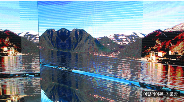 이탈리아관은 전시실 하나하나 카피가 돋보이는데 특히 “The Strength of beauty" 존에서는 사면 거울속의 광활한 이탈리아 자연을 보게 되는데, 관람객 모두 놀라운 광경에 입을 다물지 못하게 된다. 거울 속의 대자연은 사계절을 표현하며 자태를 뽐내고 있다.