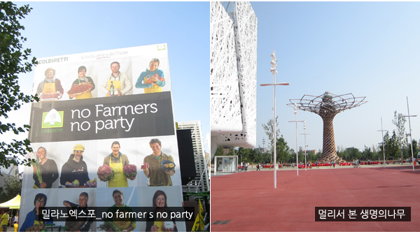 밀라노엑스포 한 건물 벽면에는 커다랗게 “NO FARMERS NO PARTY” 라는 문구가 쓰여 있고 그 아래 원산물을 재배하는 농부들의 모습이 있다. 이 캐치프레이즈 하나로도 엑스포가 대변될 수 있다고 생각한다.
