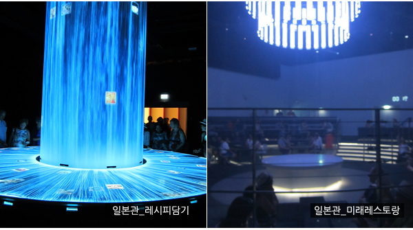 일본관은 각 전시실마다 관람시간을 철저히 정해놨고 일정 인원만큼 단체 행동하도록 만들어놨기에 상당한 시간이 걸리는 구조이다. 전시를 제대로 보여주기 위한 것은 이해가 되나 전시의 자율적 측면에서는 불편함을 토로하는 사람들도 있었다. 그리고 일본관을 나오면 카레점 ‘코코이찌방야’, 라이스버거를 판매하고 있는 ‘모스버거’ 등이 일본음식응대를 하고 있다.