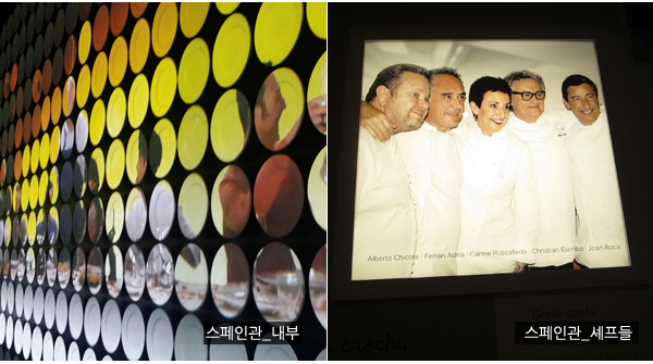 현재는 휴업상태인 세계 탑레스토랑 ‘엘불리(El Bulli)’의 셰프 ‘ 페란 아드리아 (Ferran Adria)’는 진정 스페인국민의 자랑임을 전시에서도 확인하게 된다. 또 다른 방에는 꿀처럼 흘러내리는 올리브유(ACEITE DE OLIVIA)가 전시되어 지중해 식문화를 자랑한다. 하몬(이베리코 돼지고기로 만든 햄), 리오하 와인 설명도 쉽게 소개하고 있다. 스페인관 옆에는 타파스를 맛볼 수 있는 테라스레스토랑을 가지고 있다.