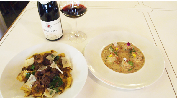 가리비 관자, 화이트크림소스 그리고 야채들이 들어갔다. 입안에 넣자 마자 부드럽게 씹히는 가리비 관자에 잘게 썬 야채가 들어가 식감의 조화가 엿보인다. 크림 소스에 마티니가 들어가 은근한 향이 절묘한 스튜다. 진한 라구 향의 소꼬리 라구소스 파파르델레는 십여 년 전부터 셰프가 해왔던 클래식한 메뉴. 소꼬리 부위를 5시간정도 찌고 유럽방식대로 덩어리진 고기를 오랜 시간 레드 와인과 농축시켜 스스로 결대로 찢어지도록 조리하는 것이 포인트다. 파파르델레 면(납작하고 길며 폭이 넓은 파스타면)이 묵직한 라구 소스(미트 소스의 일종)의 맛을 뒷받침해주며 푹 쪄냈기 때문에 포크만 살짝 대도 고기가 연하게 풀어진다.