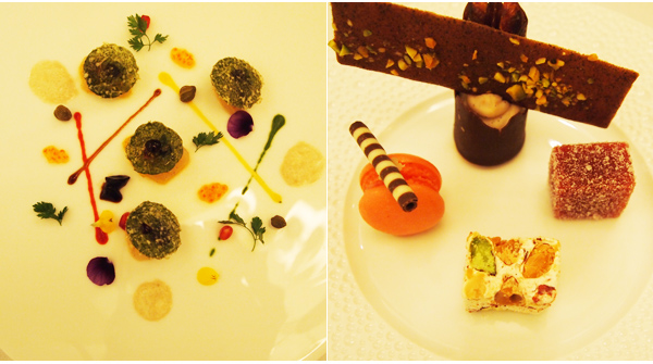 (저녁코스기준) 가장 먼저 아뮤즈 부쉬가 나온다. 보기만해도 앙증맞은 치킨미니버거, 크러플 크림과 자몽 젤리가 들어간 청포도, 과일과 야채샐러드가 올라간 비스켓, 늙은 호박과 단감 꼼포트에 오징어 볶음을 올린 한입거리 등으로 다음 요리에 대한 부푼 기대를 갖게 한다.