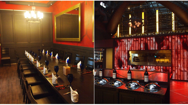 매장에 들어서면 140여 석의 규모에 놀라고 높은 천장 아래 중앙에 우뚝 솟은 거대한 꽃 장식에 입이 다물어지지 않는다. 현지 매장들과 동일한 꽃 장식은 미국에서 공수한 것으로 텍사스데브라질의 상징이라고 할 수 있다. 브라질의 화려함과 열정이 인테리어에 묻어 나오는 듯하다. 중앙의 샐러드 바를 중심으로 한쪽에는 단체모임을 위해 분리된 공간이 보인다. 그 뒤 마치 쇼 무대 같은 붉은 LED 불빛 오픈키친 안 고기를 굽는 카버들이 눈에 띈다. 바로 다양한 스테이크를 슈하스코 그릴에 직화로 구워내는 공간이다.