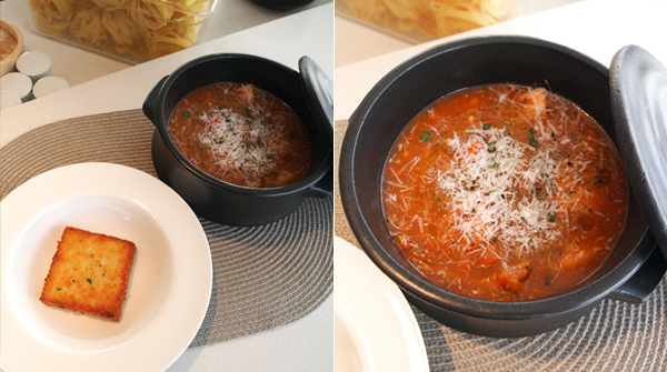 최상급 돼지고기인이베리코 돼지 목살을 사용해 사과와 각종 야채들과 푹 끓여낸 스튜에는 야채의 단맛이 우러나와 그 맛이 담백하고 바삭하게 구워낸 누룽지와 묘한 조화를 이룬다.