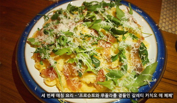 천비향의 달달함은 진한 치즈와 프로슈토가 어울렸고 씁쓸한 알코올의 뒷맛은 루꼴라의 그 맛과 조화롭게 어울렸다.
