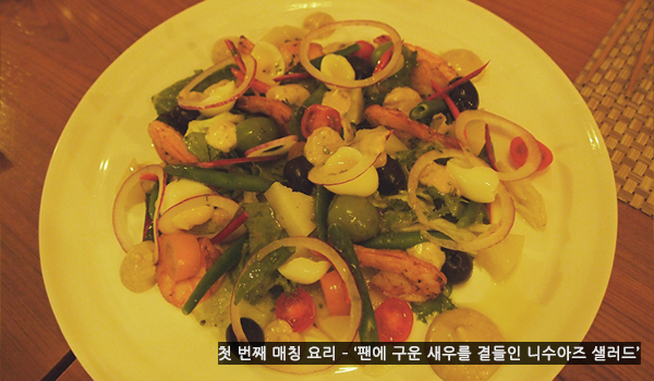 지중해 요리의 대표적 염장재료인 엔초비와 올리브, 케이퍼와 팬에 구운 새우를 넣어 달콤한 술의 맛을 더욱 배가시켰다.