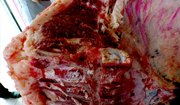 칠번 채끝 부위를 보면 소의 나이를 가늠할 수 있다. 등뼈 끝 연골의 색이 하얗게 될수록 어린 소다.